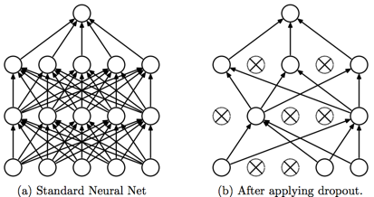 Dropout is a technique that addresses both these issues. It prevents overfitting and provides a way of approximately combining exponentially many different neural network architectures efficiently. The term “dropout” refers to dropping out units (hidden and visible) in a neural network. By dropping a unit out, we mean temporarily removing it from the network, along with all its incoming and outgoing connections, as shown in Figure D1. The choice of which units to drop is random. In the simplest case, each unit is retained with a fixed probability p independent of other units, where p can be chosen using a validation set or can simply be set at 0.5, which seems to be close to optimal for a wide range of networks and tasks. For the input units, however, the optimal probability of retention is usually closer to 1 than to 0.5.