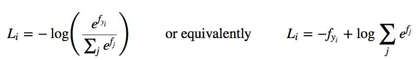 It turns out that the SVM is one of two commonly seen classifiers. The other popular choice is the Softmax classifier, which has a different loss function. If you’ve heard of the binary Logistic Regression classifier before, the Softmax classifier is its generalization to multiple classes. Unlike the SVM which treats the outputs f(xi,W) as (uncalibrated and possibly difficult to interpret) scores for each class, the Softmax classifier gives a slightly more intuitive output (normalized class probabilities) and also has a probabilistic interpretation that we will describe shortly. In the Softmax classifier, the function mapping f(xi;W)=Wxi stays unchanged, but we now interpret these scores as the unnormalized log probabilities for each class and replace the hinge loss with a cross-entropy loss that has the form: