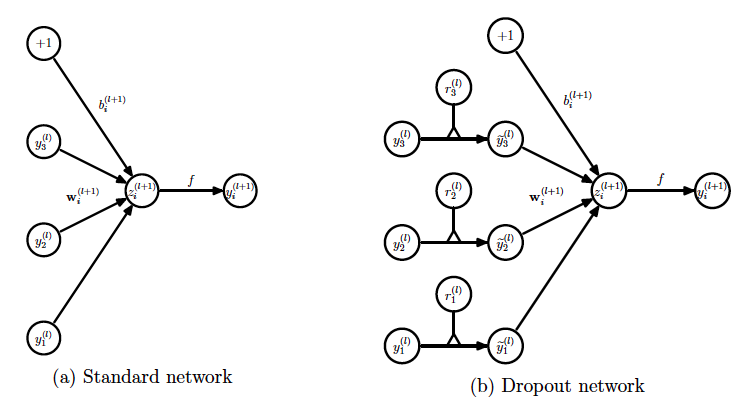 Here * denotes an element-wise product. For any layer l, r(l) is a vector of independent Bernoulli random variables each of which has probability p of being 1. This vector is sampled and multiplied element-wise with the outputs of that layer, y(l), to create the thinned outputs