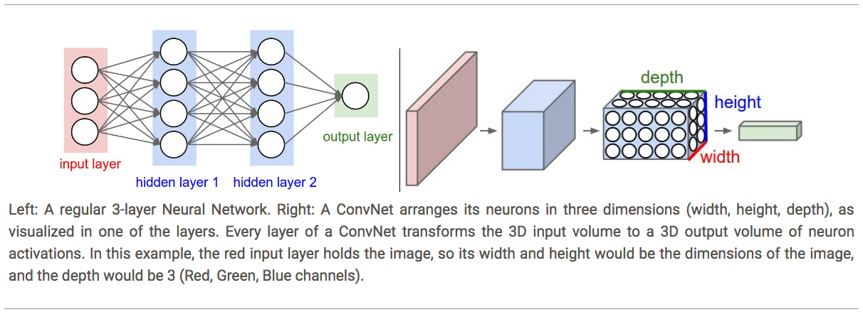 Compared to regular Neural Network, Convolutional Neural Networks take advantage of the fact that the input consists of images and they constrain the architecture in a more sensible way. In particular, unlike a regular Neural Network, the layers of a ConvNet have neurons arranged in 3 dimensions: width, height, depth. (Note that the word depth here refers to the third dimension of an activation volume, not to the depth of a full Neural Network, which can refer to the total number of layers in a network.) The input images in CIFAR-10 are an input volume of activations, and the volume has dimensions 32x32x3 (width, height, depth respectively). As we will soon see, the neurons in a layer will only be connected to a small region of the layer before it, instead of all of the neurons in a fully-connected manner. Moreover, the final output layer would for CIFAR-10 have dimensions 1x1x10, because by the end of the ConvNet architecture we will reduce the full image into a single vector of class scores, arranged along the depth dimension. Here is a visualization:
