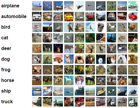 Figure 1: The catalog of CIFAR-10, images are from http://www.cs.toronto.edu/~kriz/cifar.html website.